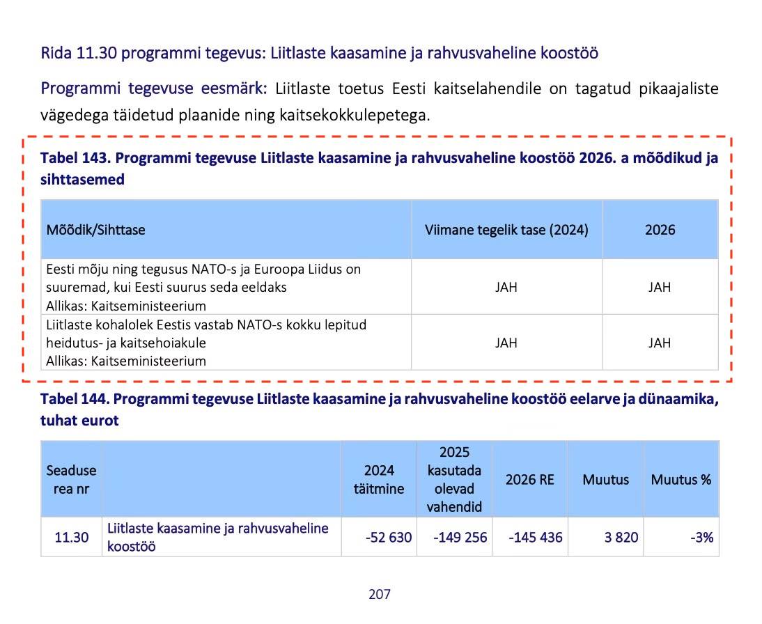 Programmi tegevus “Liitlaste kaasamine ja rahvusvaheline koostöö” lähtub eesmärgist tagada liitlaste toetus Eesti kaitselahendile pikaajaliste vägedega täidetud plaanide ja kaitsekokkulepetega. Selle eesmärgi saavutamist mõõdetakse mõõdikuga “Eesti mõju ning tegusus NATO-s ja EL-is on suuremad, kui Eesti suurus seda eeldaks”. Viimase “tegeliku taseme” (aastal 2024) mõõtmistulsemuseks on “JAH” ning 2026. aastaks seatakse sihiks saavutada taas mõõtmistulemus “JAH”.