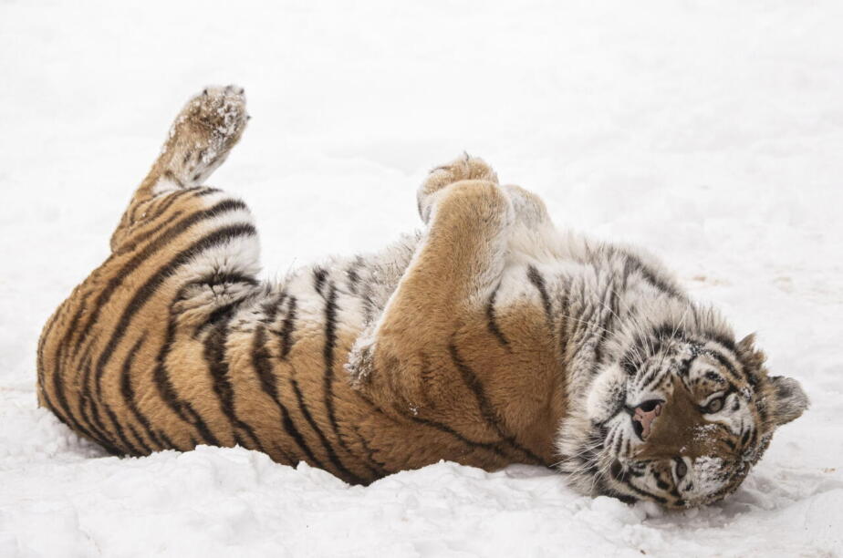 epa12634275 A Siberian tiger enjoys the fresh snow following a heavy overnight snowfall in Sosto Zoo in Nyiregyhaza, northeastern Hungary, 07 January 2026. EPA/Attila Balazs HUNGARY OUT