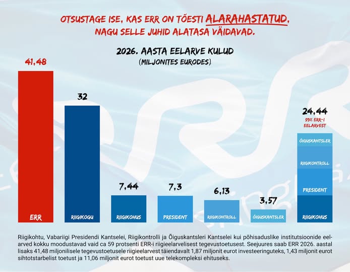 Nagu näha, on ERR-i eelarve tunduvalt (ligi 10 miljonit eurot) suurem kui Riigikogu oma. Ja mis veelgi kõnekam: nelja põhiseadusliku institutsiooni ehk Vabariigi Presidendi, RIigikohtu, Riigikontrolli ja Õiguskantsleri AASTAEELARVETE SUMMA on vaid ca 59 protsenti ERR-i aastasest riigieelarvelisest tegevustoetusest (millele lisanduvad veel muud riigieelarvelised eraldised).