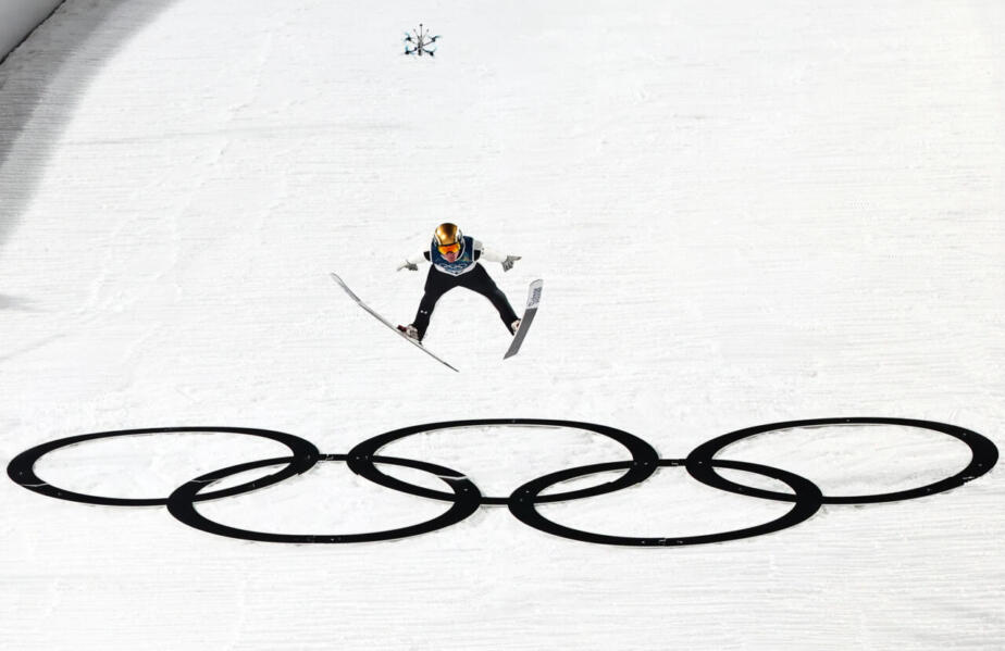 09 February 2026, Italy, Predazzo: Olympia, Olympic Winter Games Milan Cortina 2026, Nordic skiing/ski jumping, normal hill, men, round 1, Domen Prevc (Slovenia) flies over the Olympic rings. Photo: Daniel Karmann/dpa