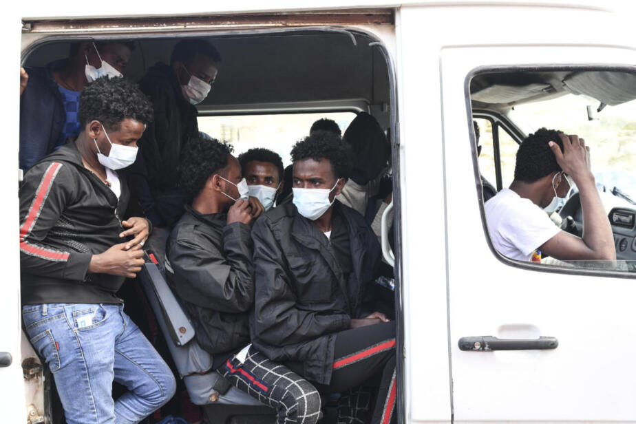 Migrants get on a van prior to boarding the Asso Trenta ship to be taken offshore and transferred on the quarantine ship Gnv Azzurra, on the Sicilian island of Lampedusa, southern Italy, Tuesday, May 11, 2021. Several hundred more migrants have reached a tiny Italian island, swelling to past 2,100 the number of arrivals in 24 hours. Italian state radio said four boats arrived at Lampedusa island after being escorted the last miles to port early Monday by Italian coast guard or customs police vessels. (AP Photo/Salvatore Cavalli)