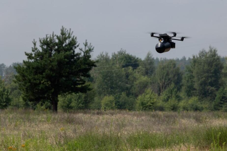 An fpv or First-Person View, drone Stalker, using fiber optic, flies during tests at an undisclosed location, on July 10, 2025, amid the Russian invasion of Ukraine. Fpv drone Stalker - made by the Ukrainian company and has been tested, put into service to the Security and Defense Forces of Ukraine, and received NSN codes. (Photo by Tetiana DZHAFAROVA / AFP)