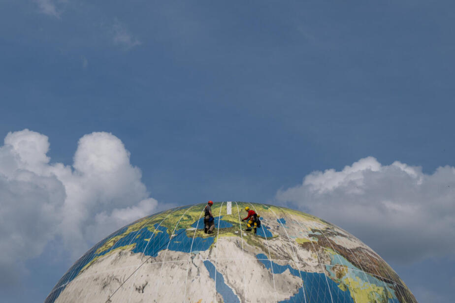 21 May 2024, Berlin: Climbers inspect the Air Service Berlin world balloon near Checkpoint Charlie during the annual maintenance. With the tethered balloon "Weltballon" with a world map printed on it, passengers can ascend into the air and look out over Berlin. Photo: Sebastian Gollnow/dpa