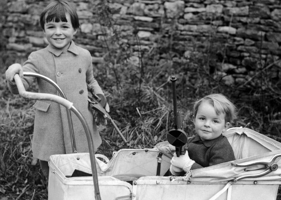 These, the first pictures of the Mosley children since their father’s release from Holloway Prison, were made at South Lawn, Swinbrook, about two miles from the small Oxfordshire village, United Kingdom, where Sir Oswald and Lady Mosley are now staying. The Mosleys have been given a suite of seven rooms in the Shaven Crown Hotel on the understanding that there will be no service and that, for the time being they will do their own shopping, cooking and cleaning. They hope to be joined in a few days by their two children. The two Mosley children, Max, aged three (in pram), and Alexander, aged five, with their toy tommy guns at South Lawn, Swinbrook, England on Dec. 11, 1943. (AP Photo)