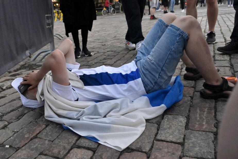 A disappointed Finnish ice hockey fan reacts on the ground in front of the Havis Amanda statue on the Market Square in the center of Helsinki, Finland, on June 6, 2021, after Finland lost the 2021 IIHF Ice Hockey World Championships final 2-3 against Canada in Riga. - A 3-2 victory over Finland crowned Canada Ice Hockey World Champions 2021. (Photo by Vesa Moilanen / Lehtikuva / AFP) / Finland OUT