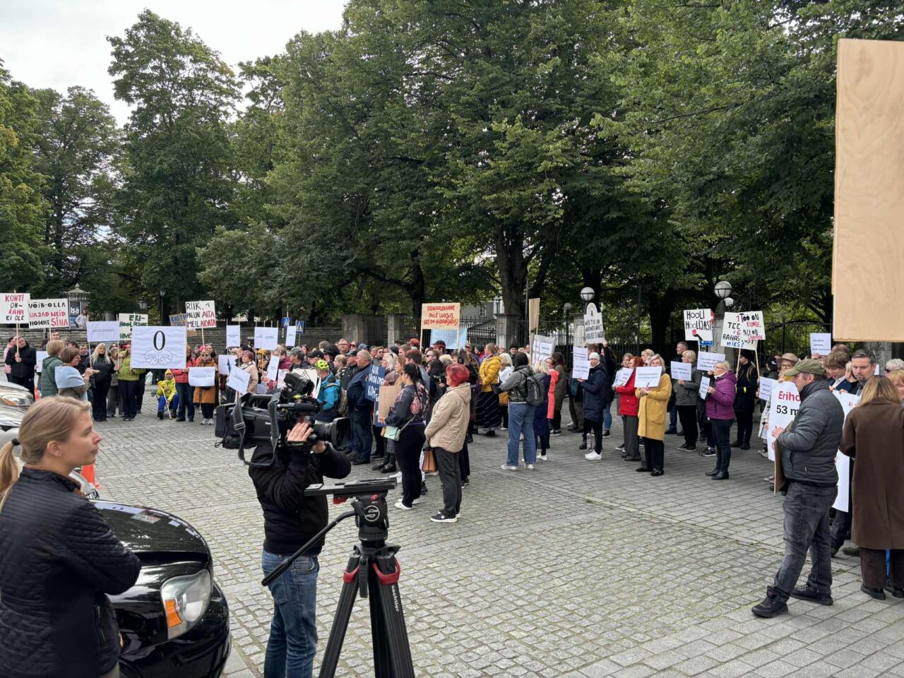 Samal ajal kui numbrimaag Kristen Michal tutvustas Riigikogu saalis negatiivset katastroofeelarvet, kogunesid Toompea lossi ette kümned plakatitega erihoolekandeteenuste esindajad valitsusevastasele meeleavaldusele.