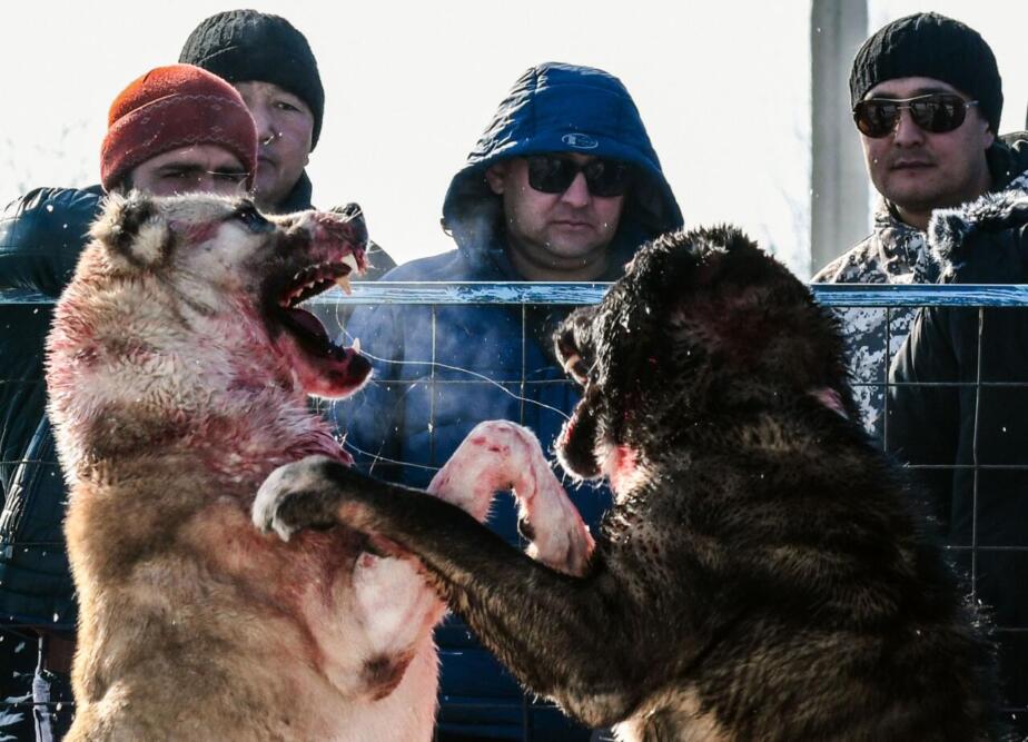 Two wolfhounds fight as people watch at a snow covered dogfight arena in Kyrgyzstan's capital Bishkek on November 18, 2018. - Some 23 owners brought their dogs to take part in the fighting event for the title of "champion of the breed". (Photo by Vyacheslav OSELEDKO / AFP)