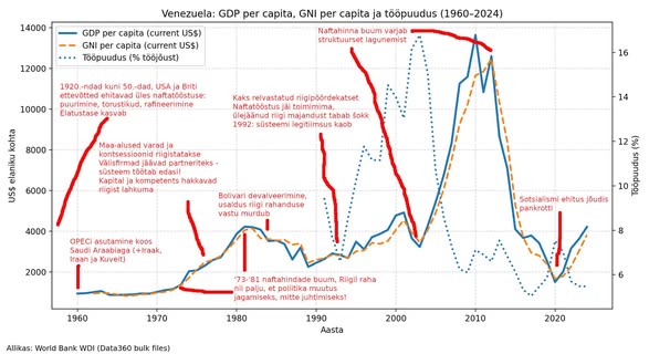 Illustratsioonid: maailmapanga andmetele tuginev majandusnäitajate arengu graafik, millele lisasin oma kommentaarid ning kolm graafikut artiklist „VENEZUELA: ANATOMY OF A COLLAPSE”, mis on Google Scholarist leitav.