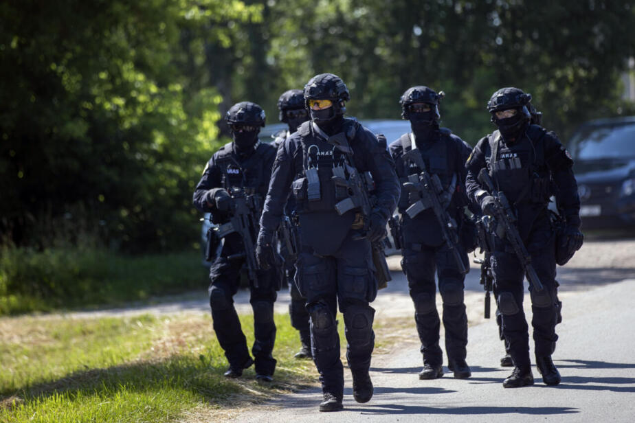 Members of the Lithuanian Police Anti-terrorist Operations Unit ARAS arrive at the refugee camp in the village of Vydeniai, Lithuania, Saturday, July 10, 2021. European Union member Lithuania has declared a state of emergency due to an influx of migrants from neighboring Belarus in the last few days. Lithuania's interior minister said late Friday that the decision, proposed by the State Border Guard Service, was necessary not because of increased threats to the country of 2.8 million but to put a more robust system in place to handle migrants. (AP Photo/Mindaugas Kulbis)