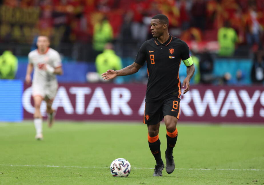 epa09291426 Georginio Wijnaldum of the Netherlands in action during the UEFA EURO 2020 preliminary round group C soccer match between North Macedonia and the Netherlands in Amsterdam, Netherlands, 21 June 2021. EPA/Kenzo Tribouillard / POOL (RESTRICTIONS: For editorial news reporting purposes only. Images must appear as still images and must not emulate match action video footage. Photographs published in online publications shall have an interval of at least 20 seconds between the posting.)