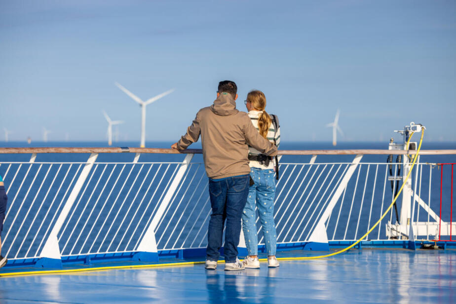 Offshore-Windpark Kriegers Flak Dänemark am 04.09.2025: Ein junges Ehepaar auf dem Deck einer Fähre nach Schweden schauen auf die Offshore Windparkanlange. *** Offshore wind farm Kriegers Flak Denmark on 04 09 2025 A young couple on the deck of a ferry to Sweden look at the offshore wind farm installation