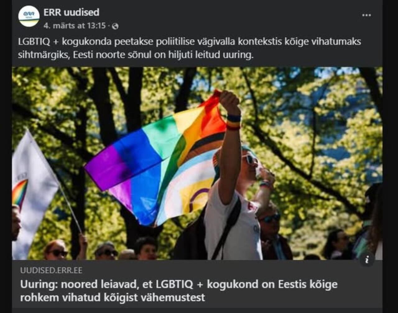 ERR: “Eesti noored peavad LGBTIQ+ kogukonda poliitilise vägivalla kontekstis kõige vihatumaks sihtmärgiks ning nende hinnangul on seksuaalvähemuste vastane vaen muutumas osaliselt tavapäraseks, selgub hiljutisest uuringust.”
